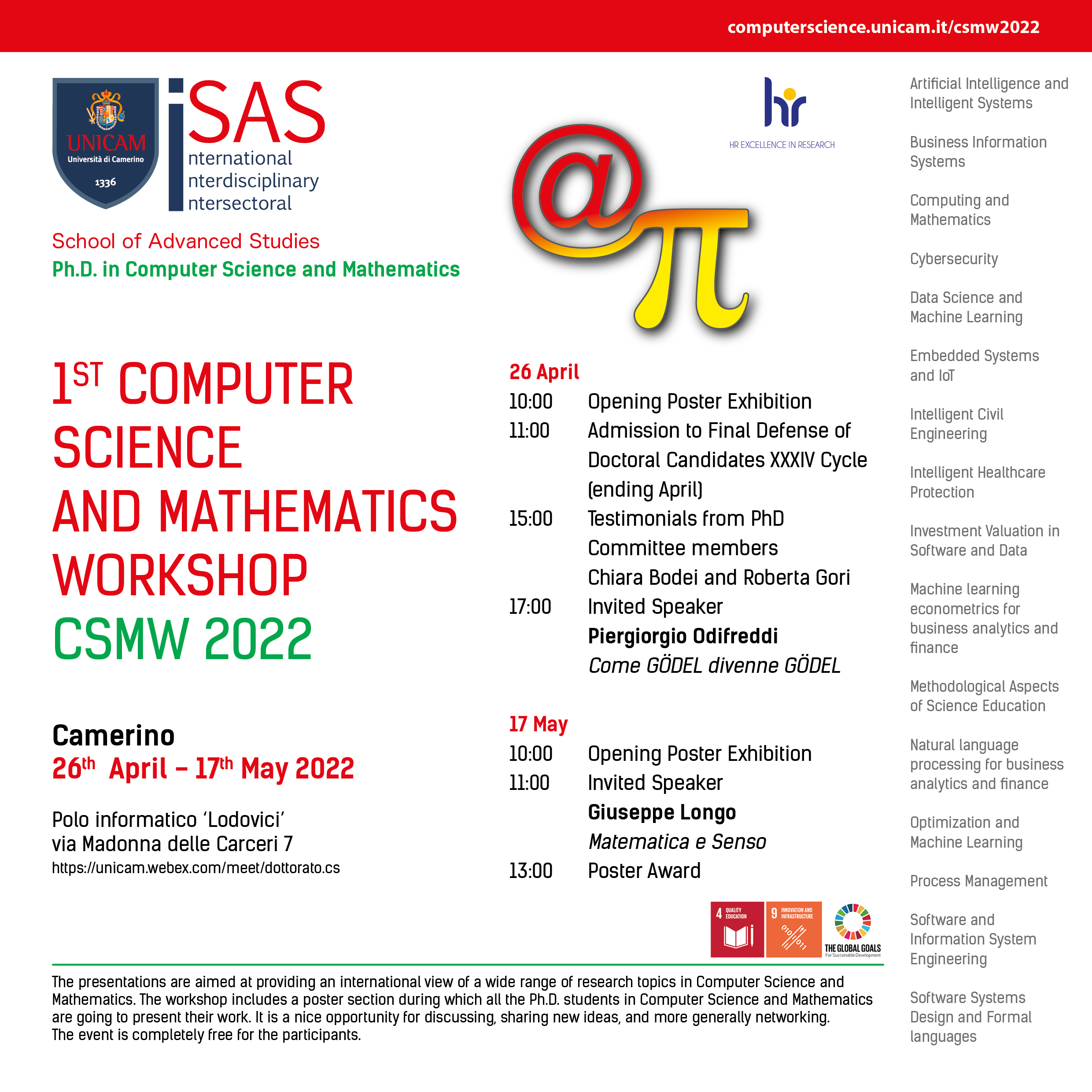 La School of Advanced Studies di Unicam organizza il "1st Computer Science and Mathematics workshop CSMW 2022. L'evento si terrà a Camerino nei giorni 26 Aprile e 17 Maggio 2022 presso il Polo informatico ‘Lodovici’ in via Madonna delle Carceri 7.