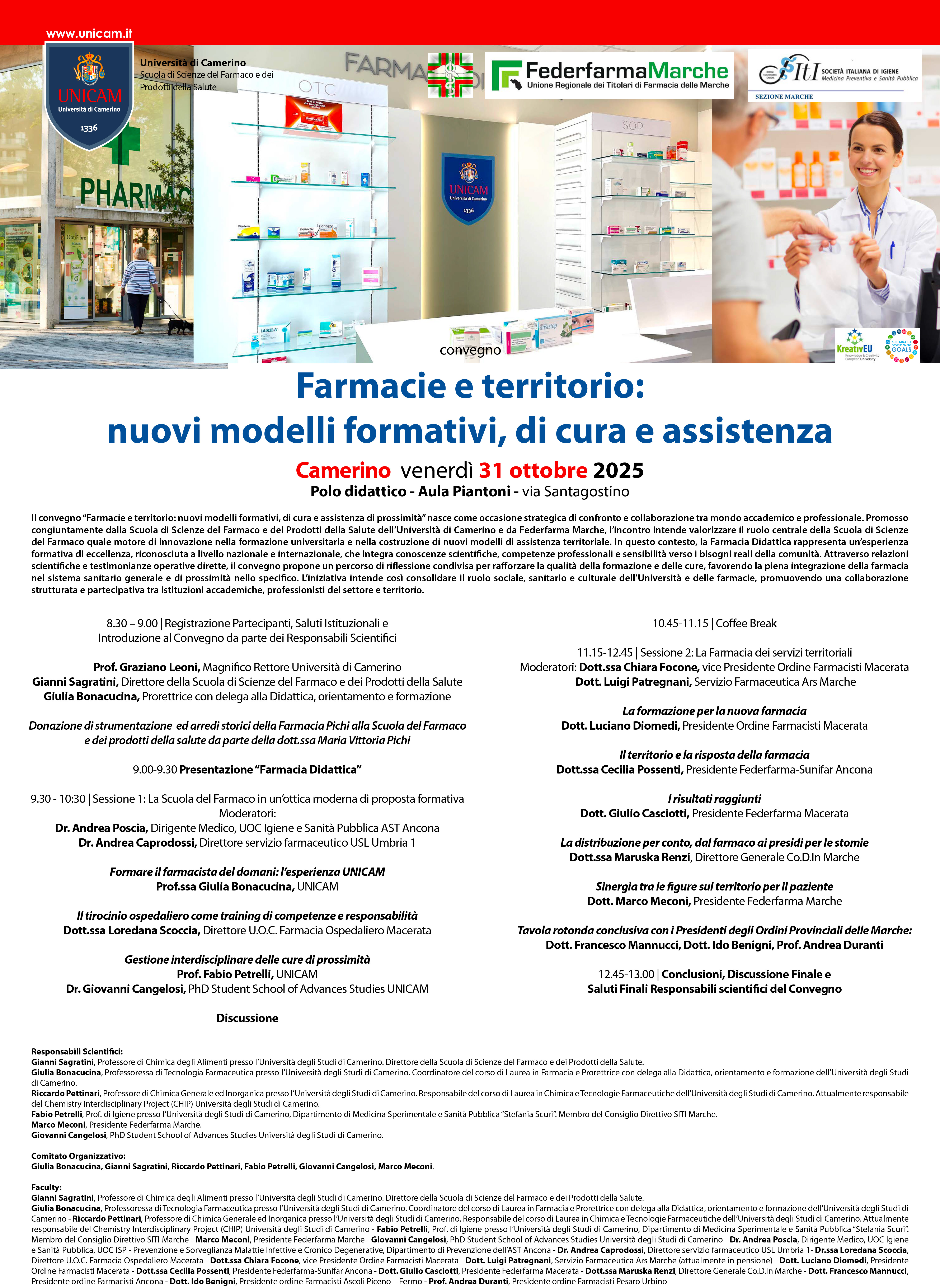 Il convegno “Farmacie e territorio: nuovi modelli formativi, di cura e assistenza di prossimità” nasce come occasione strategica di confronto e collaborazione tra mondo accademico e professionale. Promosso congiuntamente dalla Scuola di Scienze del Farmaco e dei Prodotti della Salute dell’Università di Camerino e da Federfarma Marche, l’incontro intende valorizzare il ruolo centrale della Scuola di Scienze del Farmaco quale motore di innovazione nella formazione universitaria e nella costruzione di nuovi modelli di assistenza territoriale.