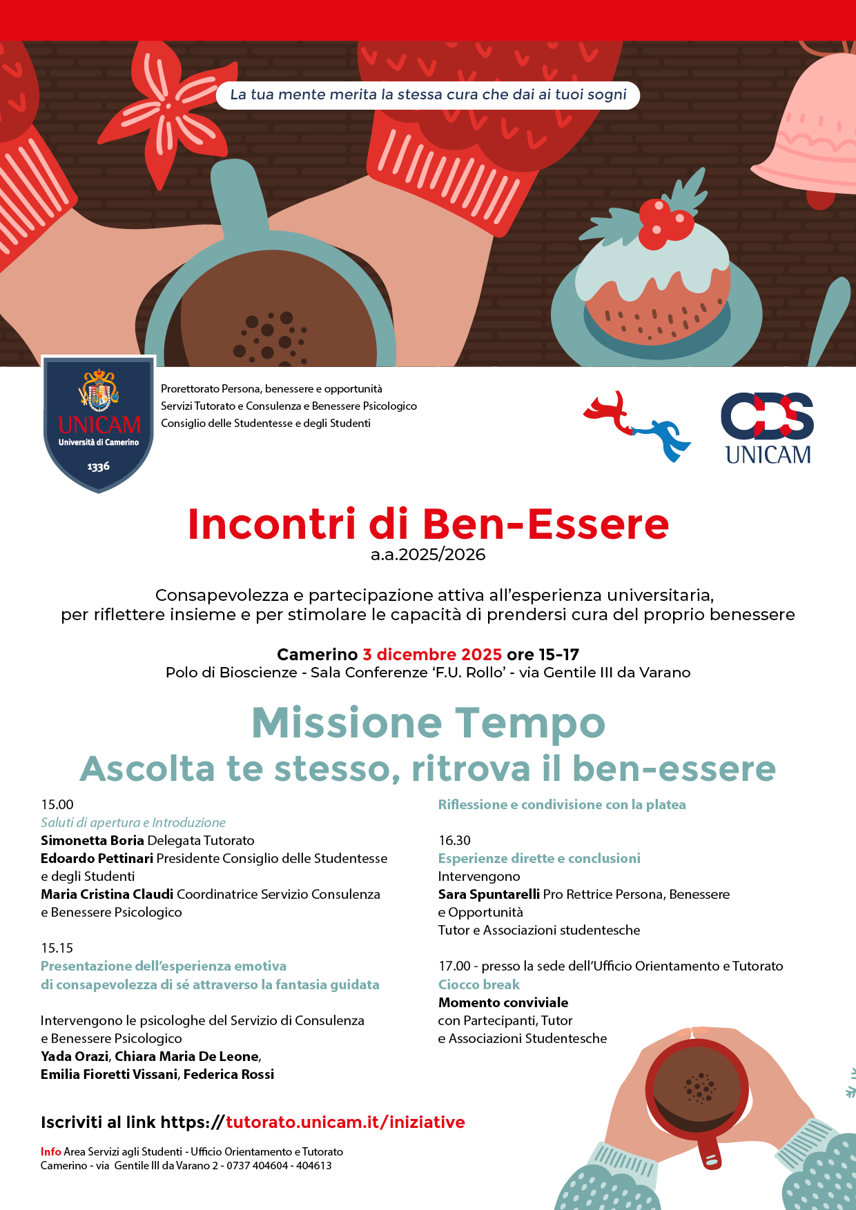 Iscriviti agli incontri di Ben-essere: al link https://tutorato.unicam.it/iniziative entro il 2 dicembre 2025