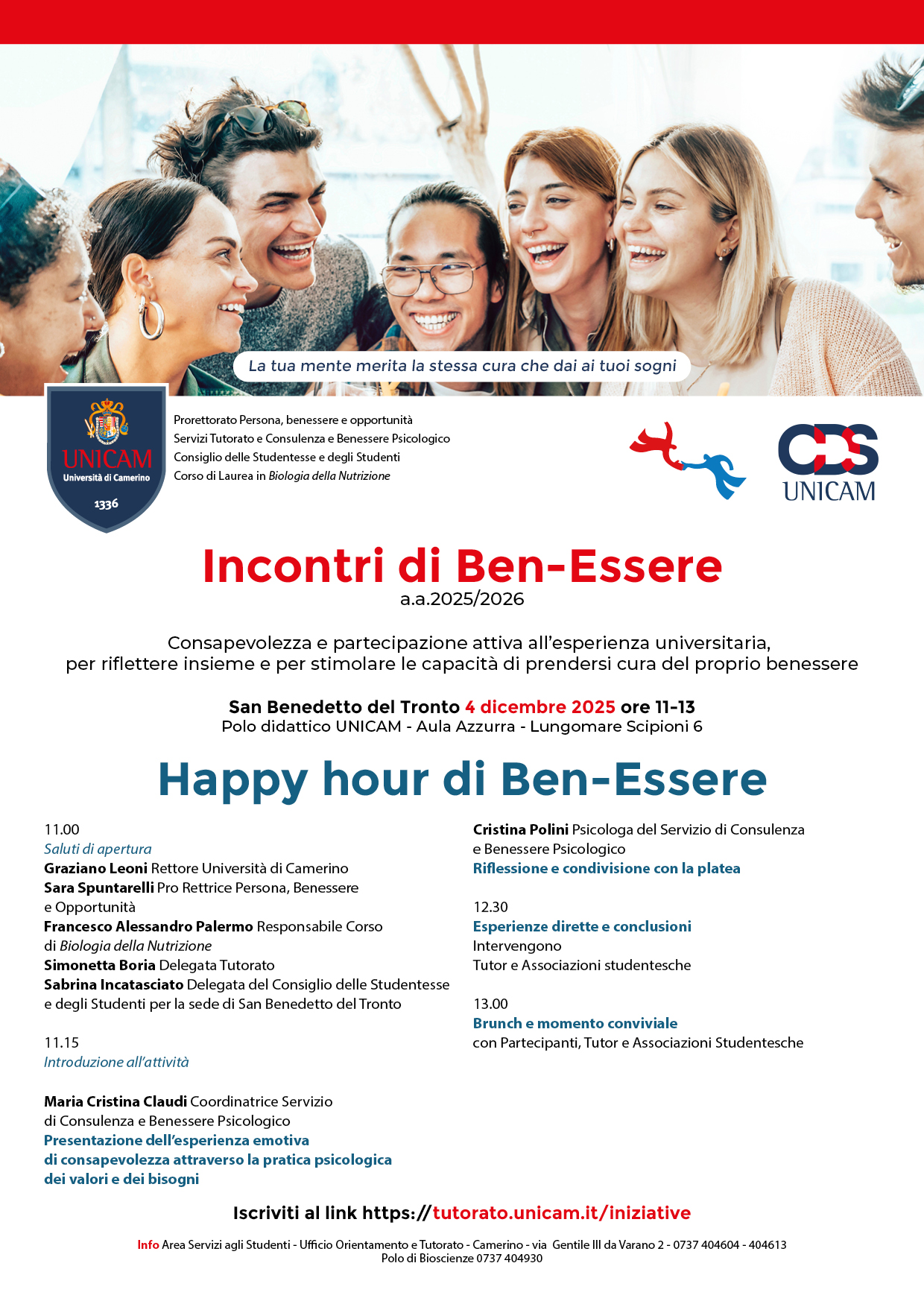 Iscriviti agli incontri di Ben-essere: al link https://tutorato.unicam.it/iniziative entro il 1° dicembre 2025